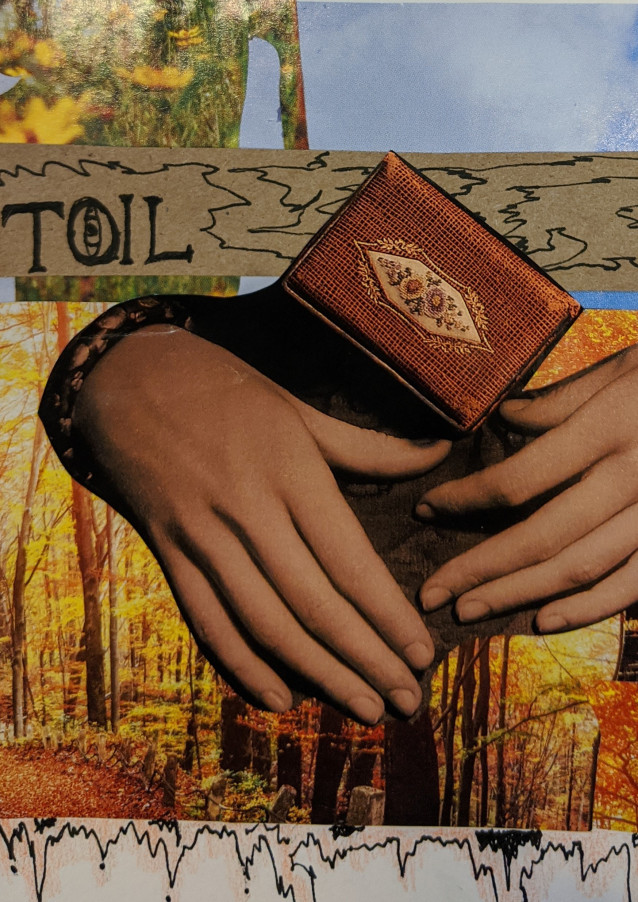 Above pictures shown left to right: epoch writing circle items; mixed media piece Harvest; close up of mixed media piece Toil, created while sitting in presence. All by Carrie Redway.